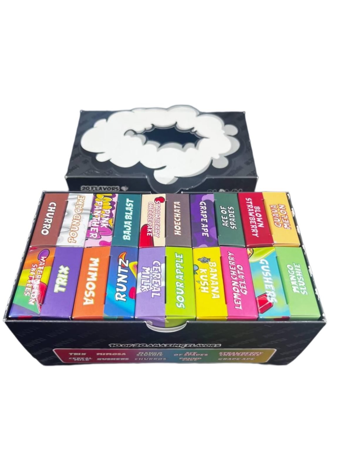 Banana Ice, Grape, Mint, Strawberry, Top Mixed, Ace of Spades, Baja Blast, Blown Strawberry, Blue Raspberry, Bubblegum, Cereal Milk, Churro, Guava Melon, Hoechate, Mango, Mimosa, Runtz, Strawberry Cheesecake, Trix, Watermelon Skittles